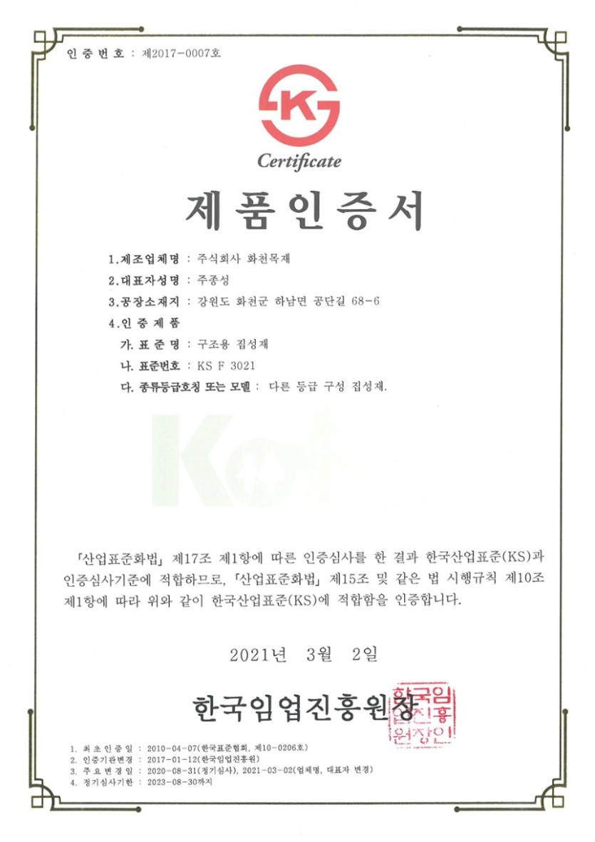 KS 제품 인증서 페이지 정보 작성자 화천목재 댓글 0건 조회 195회 작성일 23-05-28 16:28 목록 본문 KS 제품 인증서 이전글KWood 지역목재 이용제품 지정서 23.05.28 댓글 0 댓글목록 등록된 댓글이 없습니다.