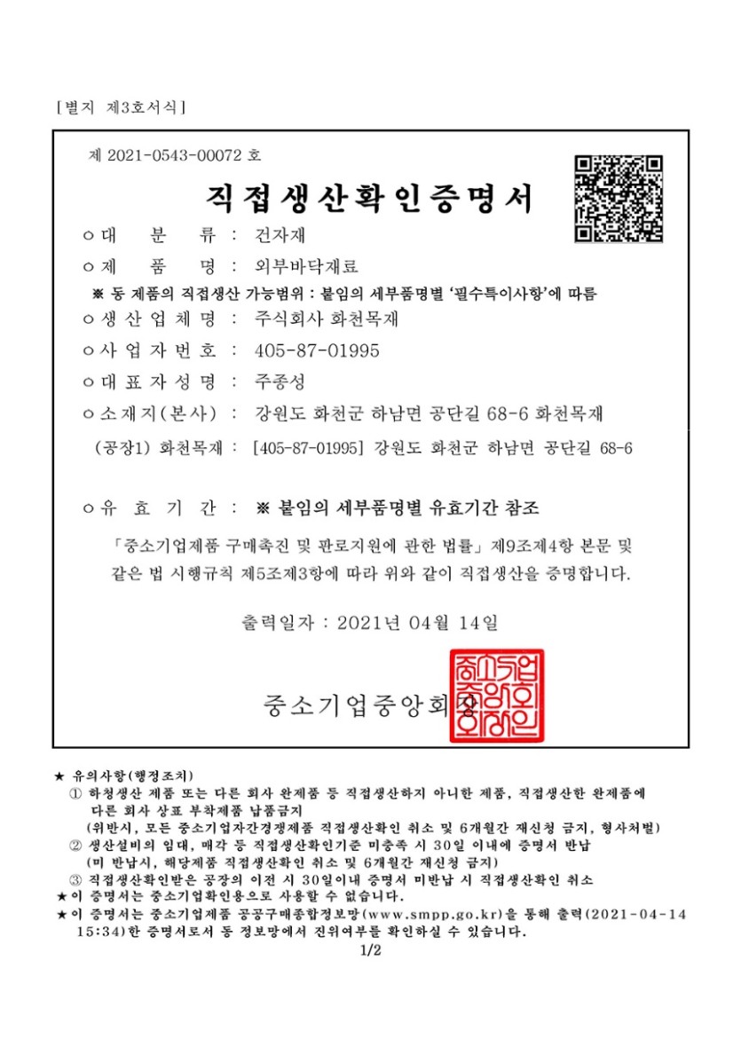 직접생산확인증명서 (건자재: 외부바닥재료) 페이지 정보 작성자 화천목재 댓글 0건 조회 165회 작성일 23-05-28 16:30 목록 본문 직접생산확인증명서 (건자재: 외부바닥재료) 이전글직접생산확인증명서 (건자재: 목재) 23.05.28 다음글KWood 지역목재 이용제품 지정서 23.05.28 댓글 0 댓글목록 등록된 댓글이 없습니다.