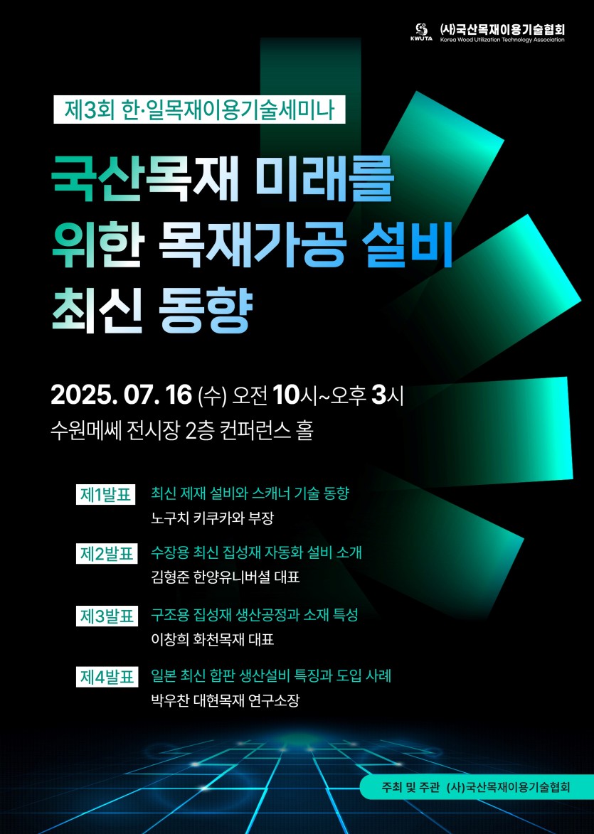 한`일목재 이용기술 세미나(2025.7.16) 페이지 정보 작성자 화천 댓글 0건 조회 174회 작성일 25-08-14 11:31 목록 본문 국산목재이용기술협회 세미나-수원메쎄 이전글2025 대한민국 목재산업 박람회 - 국산목재이용기술협회 세미나 / 화천목재 25.09.05 다음글프리컷 동영상 25.02.14 댓글 0 댓글목록 등록된 댓글이 없습니다.